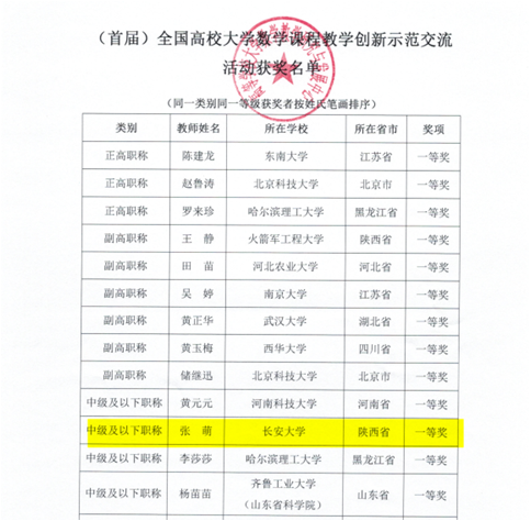 近日,首届全国高校大学数学课程教学创新示范交流活动结果揭晓,bat365理学院教师张萌荣获全国一等奖。
