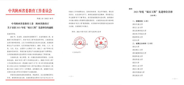 近日,陕西省委教育工委、陕西省教育厅通报了2021年度“双百工程”考核结果,bat365再度荣获“双百工程”先进单位,这是bat365自2017年“双百工程”实施以来连续第5次获此殊荣。