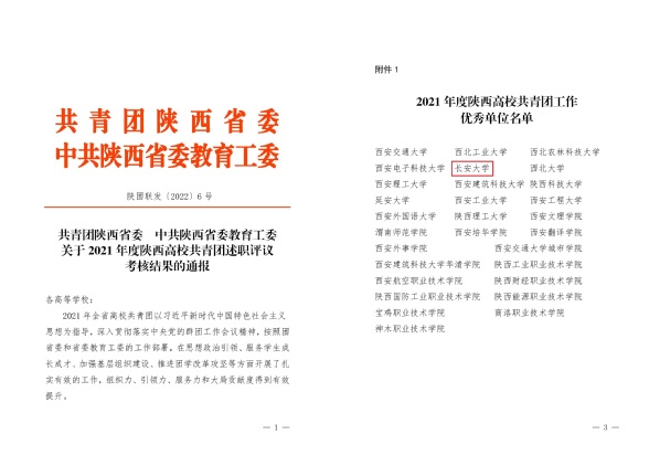 近日,共青团陕西省委、中共陕西省委教育工委印发了《关于2021年度陕西高校共青团述职评议考核结果的通报》,共青团陕西省委印发了《关于表彰2020-2021年度“陕西省优秀共青团员”“陕西省优秀共青团干部”及“陕西省五四红旗团支部”“陕西省五四红旗团委”的决定》,校团委荣获“2021年陕西高校共青团工作优秀单位”称号,校党委副书记黎开谊荣获“2021年陕西高校支持共青团工作好书记”称号,校团委副书记李阳荣获“2020-2021年度陕西省优秀共青团干部”,校团委学生创新创业实践中心副主任石涌泉荣获“2021年陕西高校共青团工作先进个人”称号,校学生会执行主席张瑞熙荣获“2020-2021年度陕西省优秀共青团员”。