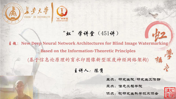 4月20日上午,由研究生院/研究生工作部主办、信息工程学院承办、校研究生科学技术协会协办的“虹”学讲堂第451讲以线上线下相结合的形式顺利举办。麦克马斯特大学陈隽教授作了题为“基于信息论原理的盲水印图像新型深度神经网络架构”的报告,信息工程学院方勇教授主持,相关学院共240余名师生参加讲座。