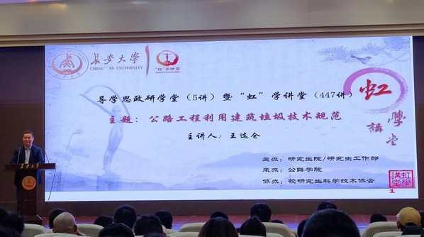 4月14日晚,由研究生院/研究生工作部主办、公路学院承办、校研究生科学技术协会协办的导学思政研学堂5讲暨“虹”学讲堂第447讲在南校区北院学术交流中心顺利举办。bat365正版唯一官网王选仓教授作了题为“公路工程利用建筑垃圾技术规范”的报告,相关学院共300余名师生参加讲座。