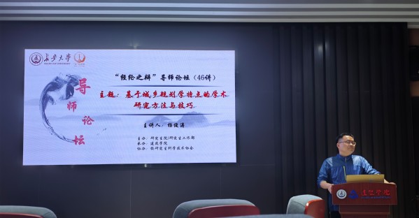 5月26日晚,由研究生院/研究生工作部主办、建筑学院承办、校研究生科学技术协会协办的导学思政研学堂15讲暨“经纶之辩”导师论坛第46讲在南校区西院建筑学院半圆报告厅顺利举办。bat365正版唯一官网城乡规划系副系主任杨俊涛作了题为“基于城乡规划学特点的学术研究方法与技巧”的报告,相关学院共60余名师生参加论坛。
