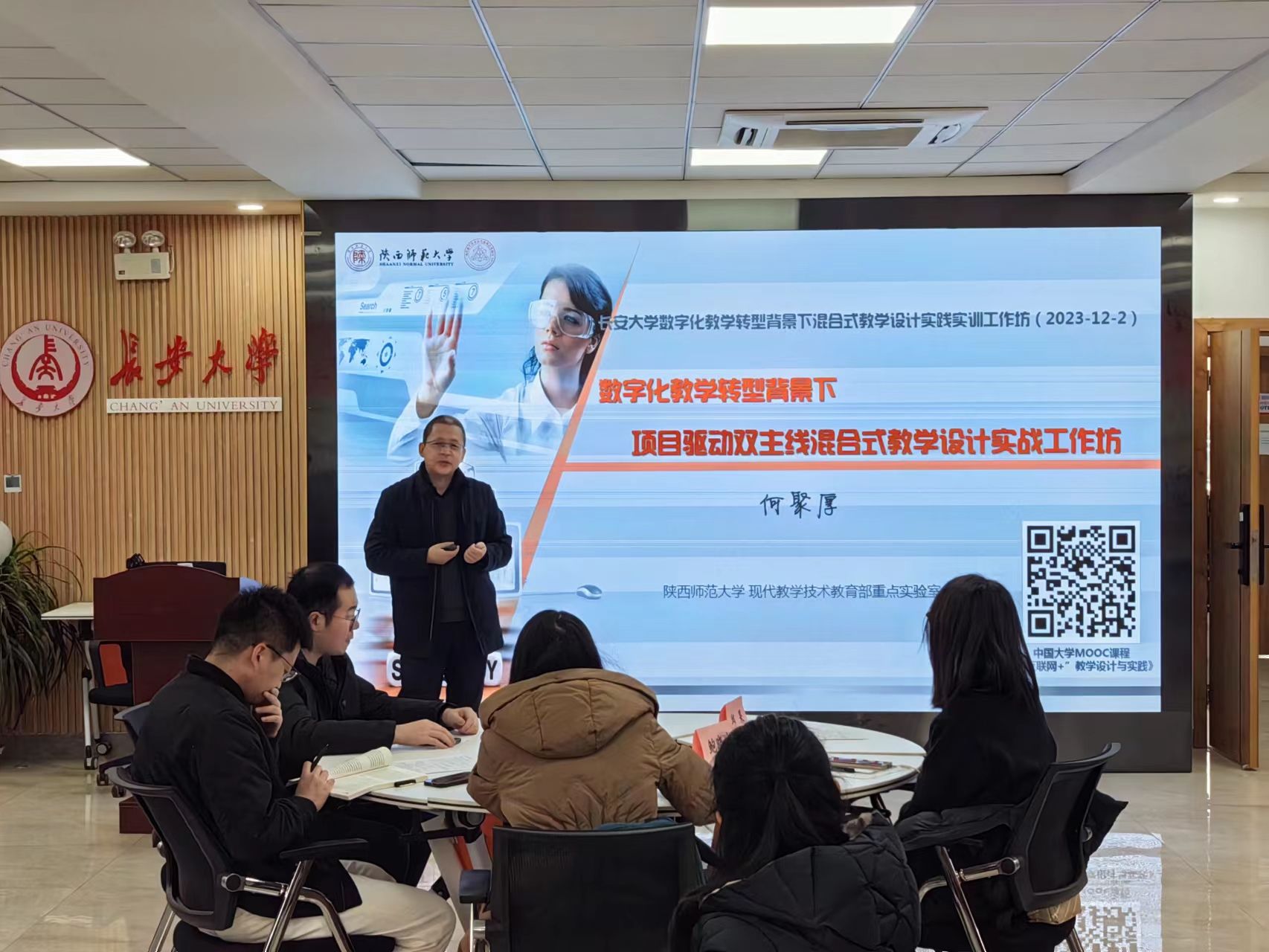 本期工作坊由现代教学技术教育部重点实验室副主任、陕西师范大学何聚厚教授担任培训导师。何聚厚教授对数字化教学转型背景下以“学生为中心”混合式教学设计作了内涵分析,从教师数字素养发展出发讲解了智慧教学发展新途径,从技术赋能角度讲解了基于混合式教学的智慧教学重构设计。在理念阐释基础上,何聚厚教授带领研修教师开展了面向数字化教学转型的混合式教学设计互动实训,研习了基于小组的项目式教学、课堂提问技巧、课堂教学策略及方式方法等教学实践能力。全体研修教师结合自身讲授课程进行了混合式教学设计与展示,何聚厚教授对小组展示内容进行了逐一点评与指导,并对线上线下混合式一流课程评价标准进行了深度解读,对大家建设和申报一流课程作了指导和建议。