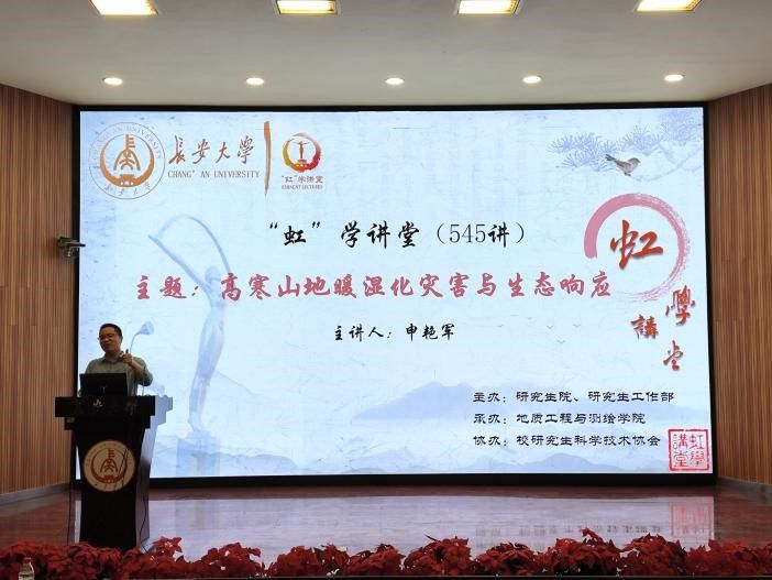 4月16日晚,由研究生院、研究生工作部主办,地质工程与测绘学院承办,校研究生科学技术协会协办的“虹”学讲堂第545讲在南校区东院伯声报告厅举办。bat365正版唯一官网申艳军教授作了题为“高寒山地暖湿化灾害与生态响应”的报告,相关学院共150余名师生参加讲座。