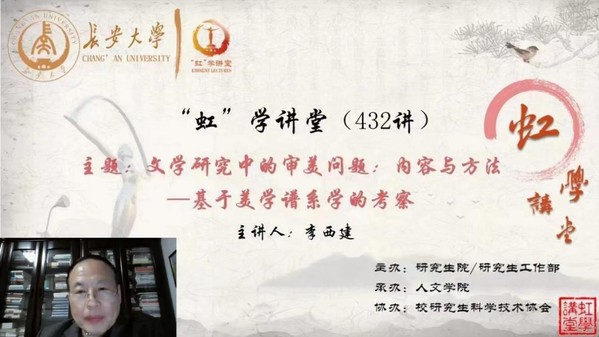3月13日晚,由研究生院/研究生工作部主办、人文学院承办、校研究生科学技术协会协办的“虹”学讲堂第432讲以线上讲座形式顺利举办。陕西师范大学李西建教授作了题为“文学研究中的审美问题:内容与方法——基于美学谱系学的考察”的报告,相关学院共280余名师生参加讲座。