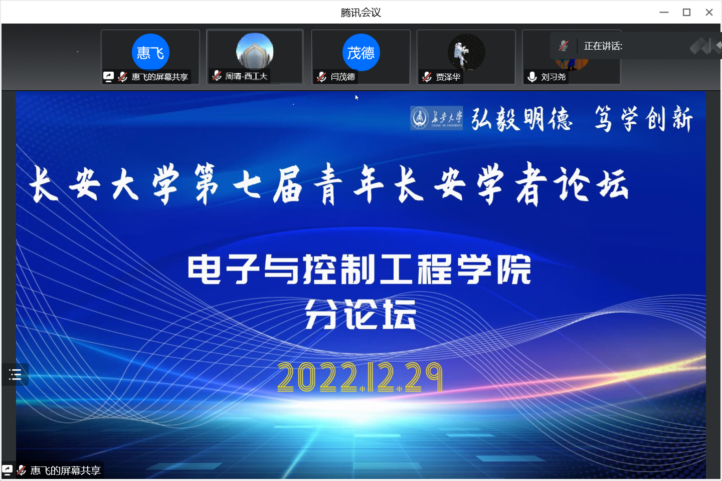 12月29日下午,学校第七届“青年长安学者论坛”电子与控制工程学院分论坛于线上举行。来自国内外知名高校的青年学者、全体院领导、系部室主任及教师代表共80余人参会。分论坛由学院副院长惠飞主持。