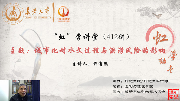 12月3日下午,由研究生院/研究生工作部主办、水利与环境学院承办、校研究生科学技术协会协办的“虹”学讲堂第412讲以线上讲座形式顺利举办。南京大学许有鹏教授作了题为“城市化对水文过程与洪涝风险的影响”的报告,水环学院罗平平教授主持,相关学院共300余名师生参加讲座。