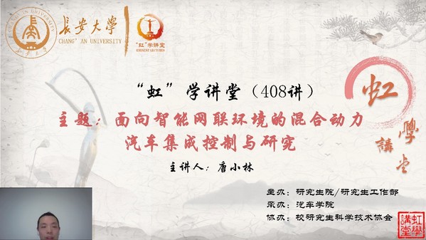 11月29日下午,由研究生院/研究生工作部主办、汽车学院承办、校研究生科学技术协会协办的“虹”学讲堂第408讲以线上讲座形式顺利举办。重庆大学唐小林教授作了题为“面向智能网联环境的混合动力汽车集成控制与研究”的报告,相关学院共300余名师生参加讲座。