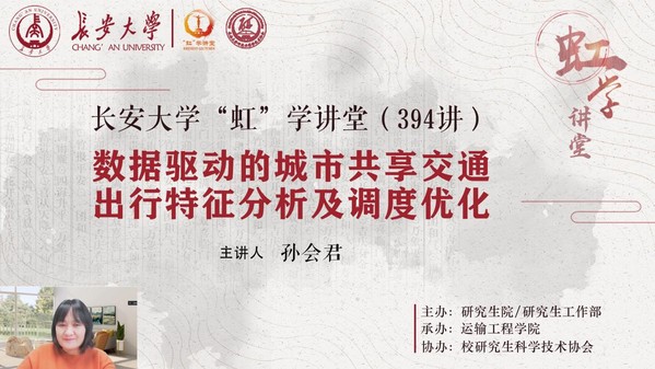 11月2日下午,由研究生院/研究生工作部主办、运输工程学院承办、校研究生科学技术协会协办的“虹”学讲堂第394讲以线上讲座形式顺利举办。北京交通大学孙会君教授作了题为“数据驱动的城市共享交通出行特征分析及调度优化”的报告,相关学院共300余名师生参加讲座。