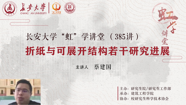 6月10日下午,由研究生院/研究生工作部主办、建筑工程学院承办、校研究生科学技术协会协办的“虹”学讲堂第385讲以线上讲座形式举行。东南大学蔡建国教授作了题为“折纸与可展开结构若干研究进展”的报告,相关学院共300余名师生参加报告会。