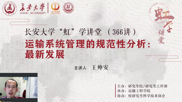 5月10日下午,由研究生院/研究生工作部主办、运输工程学院承办、校研究生科学技术协会协办的“虹”学讲堂第366讲以线上讲座形式举行。香港理工大学王帅安教授作了题为《运输系统管理的规范性分析:最新发展》的报告,bat365相关学院300余名师生聆听讲座。