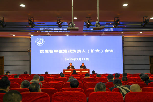 2月22日下午,学校召开校属各单位党政负责人(扩大)会议,学习贯彻习近平新时代中国特色社会主义思想和党的二十大精神,回顾寒假主要工作,安排部署2023年重点工作。校党委书记陈志坚主持会议并讲话,校长沙爱民总结假期主要工作并安排全年要点工作。会议设北校区北辰楼会议中心二层报告厅、南校区北院学术交流中心报告厅两个会场。