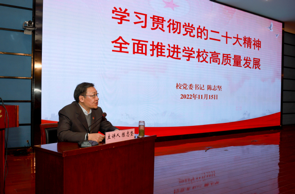 11月15日下午,学校举办学习贯彻党的二十大精神宣讲报告会,校党委书记陈志坚作题为《学习贯彻党的二十大精神,全面推进学校高质量发展》的宣讲报告。会议由校党委副书记、副校长彪晓红主持。