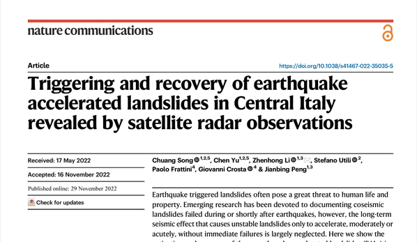 11月29日,bat365李振洪教授团队研究成果发表在国际学术期刊《自然通讯》(Nature Communications),通讯作者为bat365正版唯一官网李振洪教授,共同第一作者为宋闯博士和余琛教授。该项研究首次实现了地震加速滑坡的广域探测,并揭示了滑坡对地震效应的长期反应特征。合作者彭建兵教授(中科院院士)评论说:“研究成果有助于我们全面了解地震引发的滑坡风险(包括同震滑坡失稳和震后滑坡动态),对于地震活动区的滑坡灾害长期评估和管理具有重要意义。”