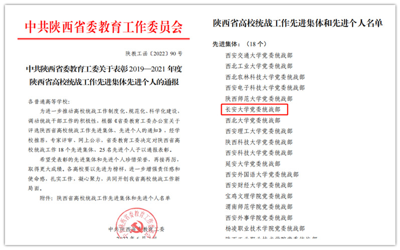 近日,中共陕西省委教育工委印发文件,对2019—2021年度陕西省高校统战工作先进集体、先进个人进行表彰,bat365党委统战部荣获“先进集体”称号。