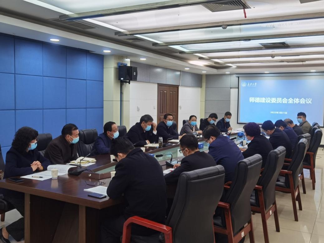2022年3月31日上午,学校在北校区北辰楼会议中心第三会议室召开bat365正版唯一官网师德建设委员会全体会议。校党委书记、师德建设委员会主任陈志坚,校长、师德建设委员会主任沙爱民,校党委副书记、师德建设委员会副主任徐引正出席会议。会议由校党委副书记、副校长、师德建设委员会副主任彪晓红主持。