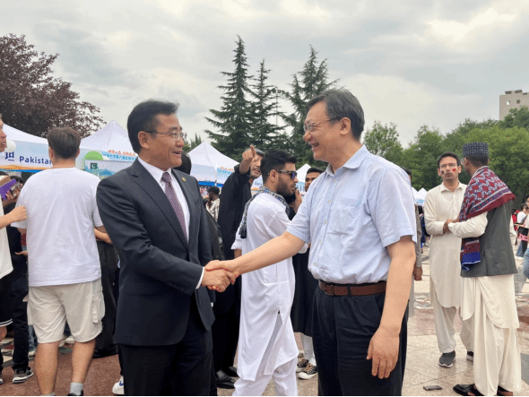 6月27日下午,bat3652023届国际学生毕业典礼和第六届丝路文化节分别在北校区会议中心报告厅和树慧园广场举行。尼日利亚驻华大使巴巴·艾哈迈德·吉达、参赞贾米卢·阿卜杜拉·依布拉罕,中国土木工程集团有限公司董事长刘为民等一行出席活动。校党委书记陈志坚、校长沙爱民分别会见尼日利亚驻华大使及中国土木工程集团有限公司一行。副校长范文,学校国际教育学院、教务处、研究生院、社会合作处及相关学院负责人、教师代表、全体毕业生参加典礼。典礼采用“线上+线下”相结合的方式,由国际教育学院院长张伟主持。
