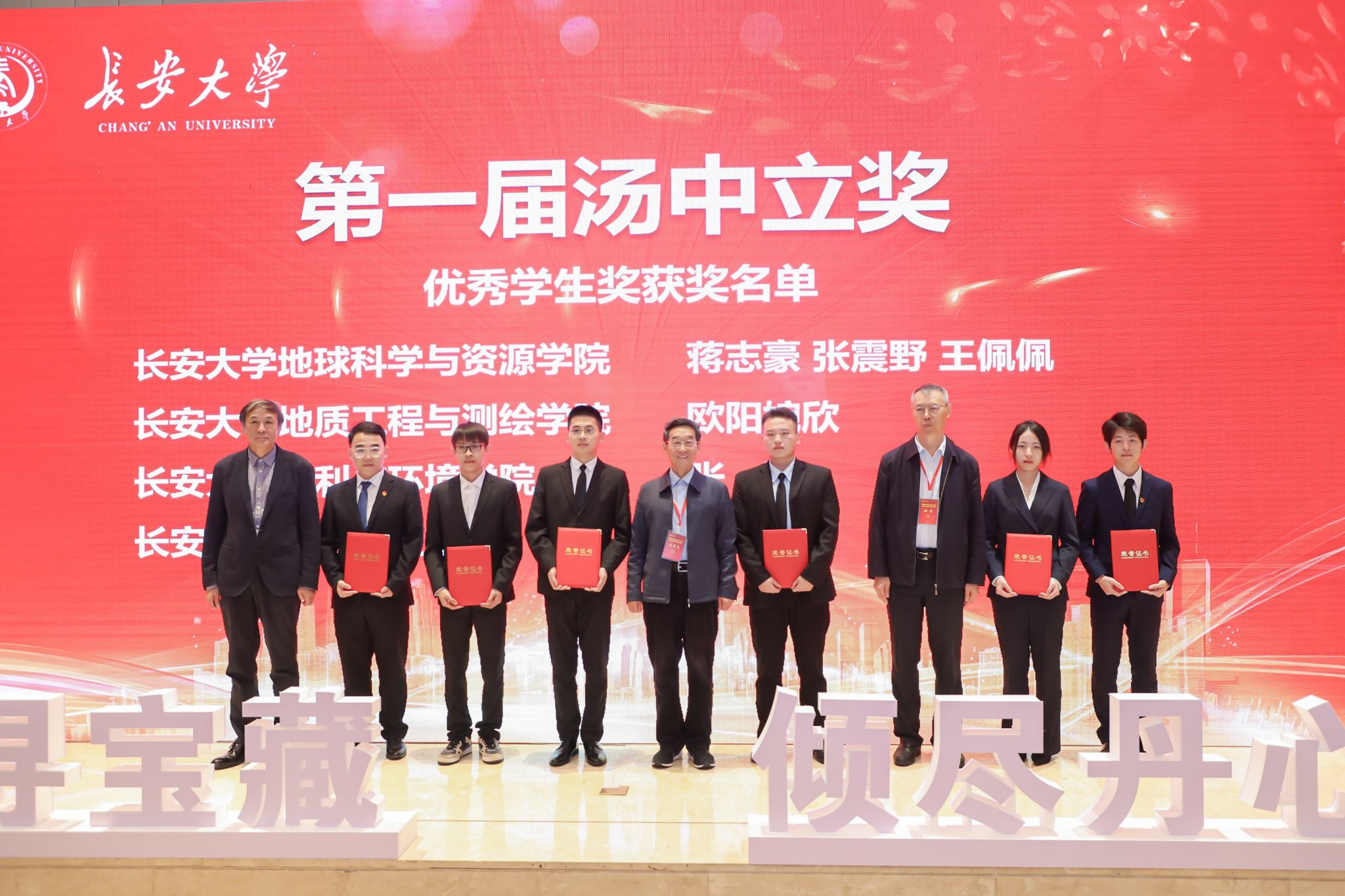汤中立奖今年是第一届评选,共有三名优秀地质矿产工作者和六名优秀学生分获“汤中立地质科技奖”和“汤中立优秀学生奖”。与会院士为获奖人员颁奖。