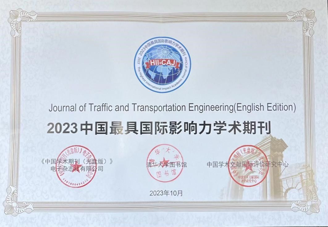 《交通运输工程学报(英文)》自2017起,连续7年入选“中国最具国际影响力学术期刊”,排名从去年第135位提升到今年第116位,国际他引影响因子从去年5.009提升到今年7.295。
