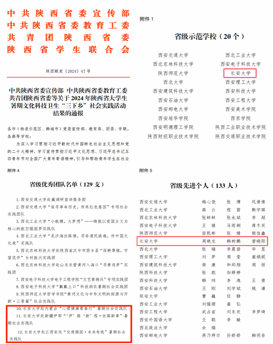 在陕西省委宣传部、省教工委、团省委、省学联组织的暑期“三下乡”社会实践活动评优中,bat365荣获“省级示范学校”称号;学工部赴内蒙古“心理健康青春行”暑期社会实践队、公路学院赴新疆伊犁“‘伊’路‘新’程·丝路新章”暑期社会实践队、能电学院赴江西安远“交通强国·未来有我”暑期社会实践队等3个团队荣获“省级优秀团队”称号;地测学院韩树鹏、建筑学院周艳龙、未来交通学院曾晓阳等3位指导教师荣获“省级先进个人”称号。
