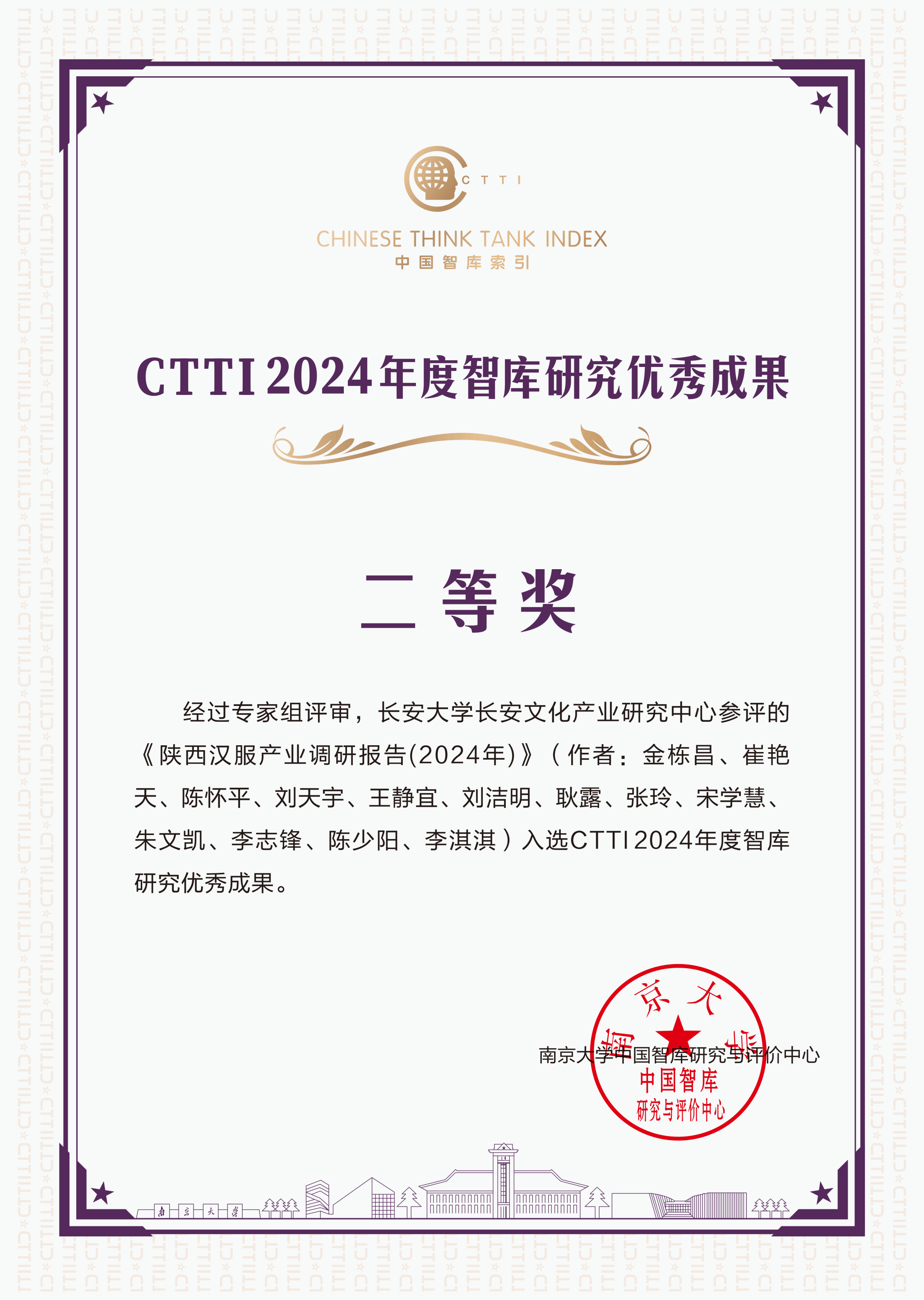 论坛发布了CTTI 2024年度智库建设最佳案例与智库研究优秀成果的征集推介结果、CTTI 2024年度增补来源智库名单。bat365《陕西汉服产业调研报告(2024年)》荣获CTTI 2024年度智库研究优秀成果二等奖,综合运输发展研究中心、长安文化产业研究中心2家平台入选“中国智库索引”(CTTI)来源智库,实现历史性突破。