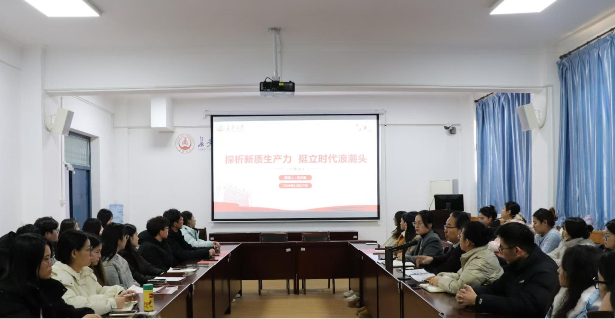 12月27日下午,副校长朱杰君以“探析新质生产力 挺立时代浪潮头”为题,在人文学院会议室为学生作专题报告。人文学院40余名学生党员参加报告会。