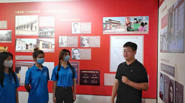 庆祝建党百年,回顾辉煌历程。在滕州美术馆,名为《辉煌历程》的党史特展引起了队员们的关注。一幅幅珍贵的历史照片,一份份承载着党的峥嵘岁月和光辉历程的档案资料都在诉说着波澜壮阔的百年历程。细细聆听中国的百年历史,队员们心潮澎湃,深受启发。“为抗日救国,滕县创办农民抗日训练班,为抗日培训骨干”。在讲到滕县训练班相关事迹时,金振广老师也向实践队员们讲述了坐落在陕西泾阳,中国共产党在抗日战争期间培训青年干部的重要场所——安吴青训练班,让队员们对抗日训练班有了更深刻的认识和感悟。
