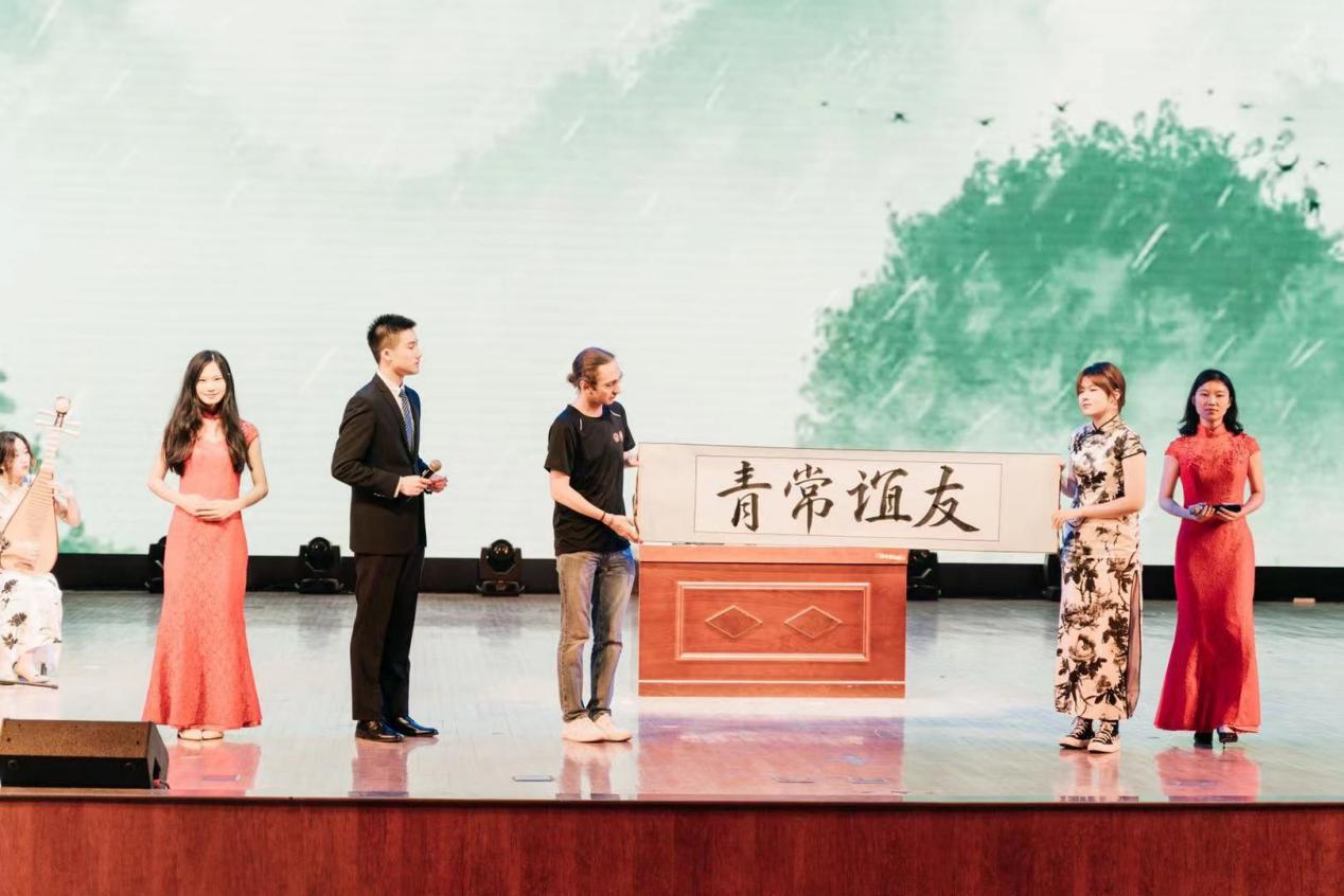 表彰仪式后,外籍教师代表DominickPrincipe和学生代表邹昌俊分别进行发言。在悠扬的琵琶声中,学生罗寓文献上书法作品《友谊常青》,祝愿夏令营期间建立的师生友谊长存,外教代表用中文予以感谢,赢得全场掌声雷动。