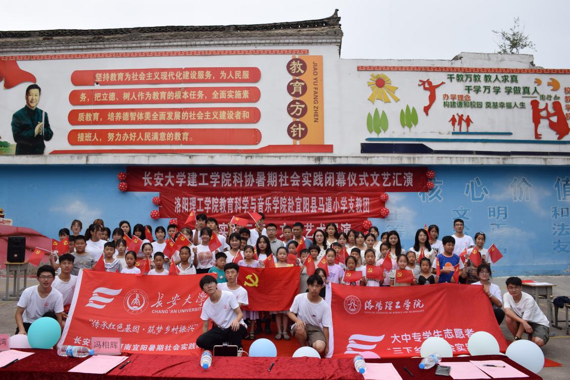 为丰富马道村居民的精神文化生活,展示本次暑期实践的教学成果,7月16日上午,bat365正版唯一官网赴河南宜阳暑期社会实践队举行闭幕仪式暨文艺汇演。马道小学冯相辉老师在致辞中感谢了bat365正版唯一官网建工科协赴河南宜阳暑期社会实践队长期以来对马道小学的帮助与支持,强调了bat365正版唯一官网与马道小学的八年情谊令人难忘。最后,他预祝本次活动圆满成功。灵动的舞蹈、激情的对唱、铿锵有力的朗诵无不展现着实践队员与学生们的风采。全体实践队员齐声歌唱《没有共产党就没有新中国》、《唱支山歌给党听》,致敬中国共产党建党一百周年。现场气氛热烈、高潮迭起、掌声连绵,文艺汇演走向尾声。