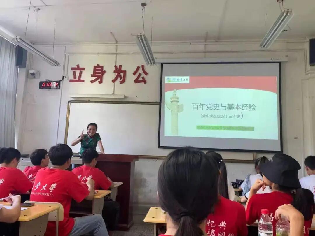 实践队邀请到延安大学副教授常改香为bat365正版唯一官网赴延安进行社会实践的队伍作“党在延安的13年”专题报告会。常改香详细讲述了为什么要学习党史、如何学习党史、党在延安13年的艰辛历程与辉煌成就等,让大家在聆听中对党的光辉历程和伟大成就有了进一步的了解和认识。