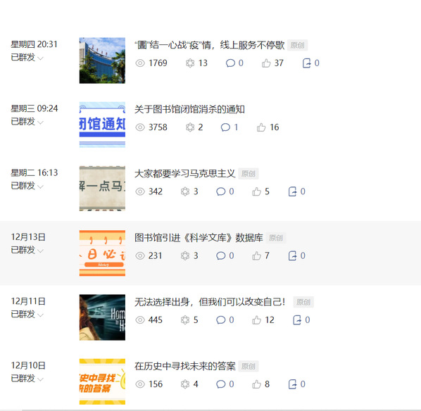 为满足疫情期间广大读者的阅读需求,图书馆本着“我为师生办实事”的初心,积极开展线上参考咨询、数字资源推广、好书推荐、精彩活动回顾等线上服务,利用网站、微信公众平台开展形式多样的疫情防控宣传服务,让读者足不出户尽情畅游书海,为长大抗疫提供精神力量。
