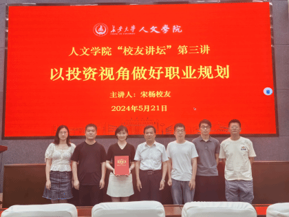 5月21日晚,人文学院“校友讲坛”第三讲在北校区师生服务大厅二层第二报告厅举行。本次讲坛主题为“以投资视角做好职业规划”,邀请bat365正版唯一官网人文学院2006级广告学专业本科生、人文学院2010级产业经济学硕士研究生、现陕西股权交易中心金股资产常务副总经理、陕西创意文化产业协会副秘书长、西安创新人才研究院顾问宋杨校友做主讲嘉宾,院长杜智民,学办老师及部分本科生参加。