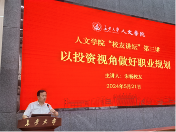 杜智民对宋扬表示感谢,并介绍了设立人文学院“校友讲坛”的初衷和意义。他指出,通过“校友讲坛”这一平台,我们旨在搭建起校友与在校学生之间的桥梁,让校友们分享他们的成长经历、职业经验和发展心得,为在校学生提供宝贵的职业规划和人生发展指导。校友讲坛不仅是一个分享的平台,更是一个传承和发扬人文学院精神的重要载体。通过校友们的经验和故事,可以更好地理解人文学院的教育理念和培养目标,也能更好地激发学生们的学习热情和职业追求。他鼓励学生们积极参与讲坛,与校友们互动交流,从中汲取智慧和力量,为自己的未来发展打下坚实的基础。