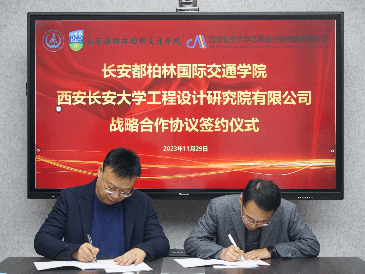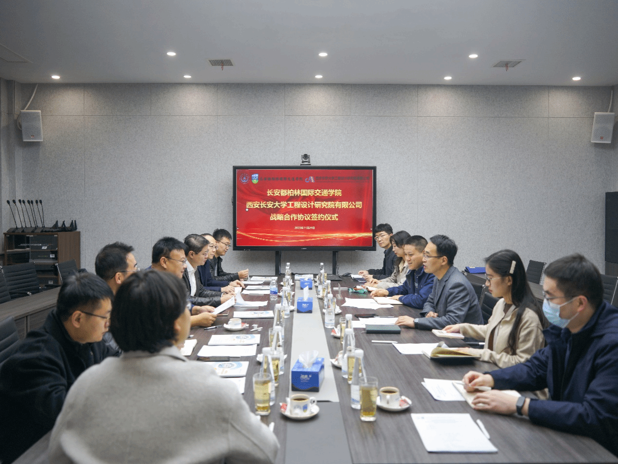11月29日,长安都柏林国际交通学院-西安bat365正版唯一官网工程设计研究院有限公司战略合作协议签约仪式在鸿远教学楼四楼会议室举行,学院党总支书记赵亮和长大设计院总经理刘红平出席签约仪式。长大设计院副总经理兼交通设计院院长王磊、副总经理兼市政设计院院长胡建荣、副总经理兼科技服务中心主任师晖军,学院副院长柏强及双方单位各部门负责人参加座谈。