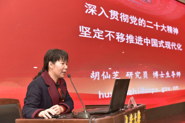 胡仙芝作了题为“深入贯彻党的二十大精神坚定不移推进中国式现代化”的辅导报告,对党的二十大、党的二十大报告以及中国式现代化进行全面解读。详细讲解了党的二十大召开过程、重要成果和历史意义,从“大会主题”“坚实基础”“指导思想”“中心任务”“战略部署”“战略保障”六个角度对二十大报告进行深刻剖析,以“中国式现代化推进中华民族伟大复兴”为切入点,深入浅出地阐述了中国式现代化的深刻内涵、重要意义和实现路径,对西方式现代化进行了比较和批判,为我们准确把握中国式现代化的科学内涵提供了新视野,为我们如何深入开展学习贯彻党的二十大精神学习活动提供了范例。