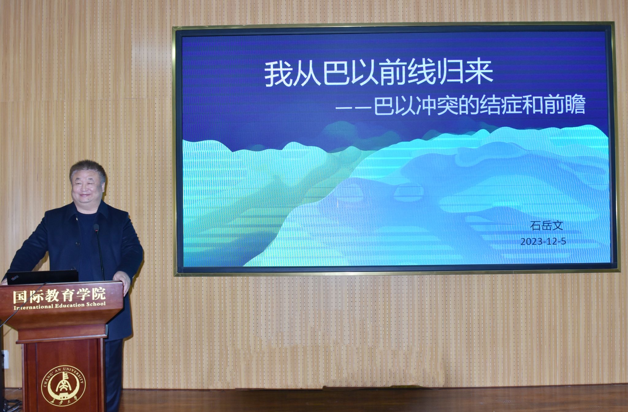 石岳文以“我从巴以前线归来——巴以冲突的结症与前瞻”为题,从以色列基本情况、巴以冲突过程、巴以冲突的启示几个方面梳理了巴以冲突历史脉络、解读巴以局势冲突始末,并就国际社会在中东和平进程中承担的责任与义务展开深入阐释,指出中国一直倡导巴以冲突的和平解决,积极推动中东和解,持续推进“一带一路”建设,中国的和平立场永远不变。
