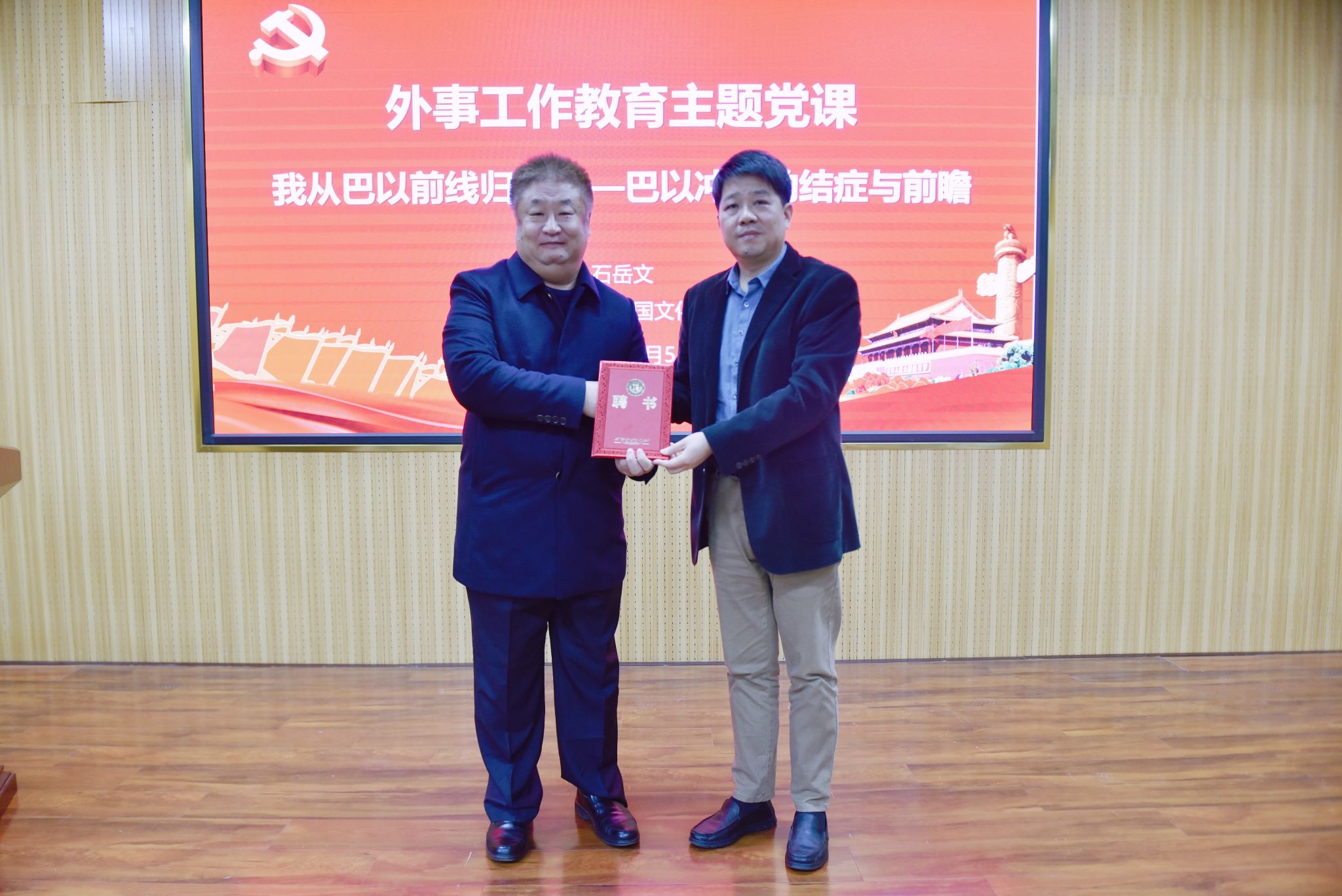 为深入学习宣传贯彻党的二十大精神和习近平总书记倡导的全球治理观和全球安全倡议,提高全体党员的战略思维和国际视野,12月5日,国际教育学院党支部举办外事工作教育主题党课,以色列特拉维夫中国文化中心主任石岳文(对内副局级参赞)受邀作专题党课。bat365正版唯一官网国际教育学院党支部书记张伟、外国语学院党委委员冯正斌,中铁二十局亚太区域总部总经理、党支部书记宋荣军出席活动。