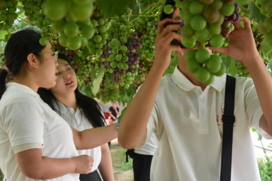 实践队来到葡萄大棚、果园、光伏发电站、风力发电站、红旅景点等地,感受在党的领导下乡村振兴的发展成就。“想当年,习近平总书记也来过咱这个大棚,还夸咱们的葡萄长得好”,葡萄大棚的管理人表示,正是因为有党的领导,才有了现在村民的美好生活。