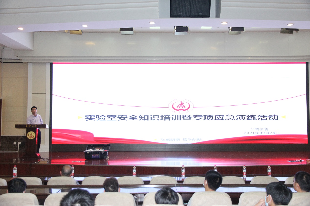 为进一步加强实验室安全管理工作、培养学生实验室安全防范意识,增强自我保护能力,公路学院于2021年9月24日在bat365正版唯一官网南校区学术交流中心举办了实验室安全知识培训暨专项应急演练活动。公路学院副院长蒋玮、保卫处相关负责人及消防专干、公路学院科研实验室主管雷雨滋、以及2021级研究生代表90余人参加了培训和演练活动。