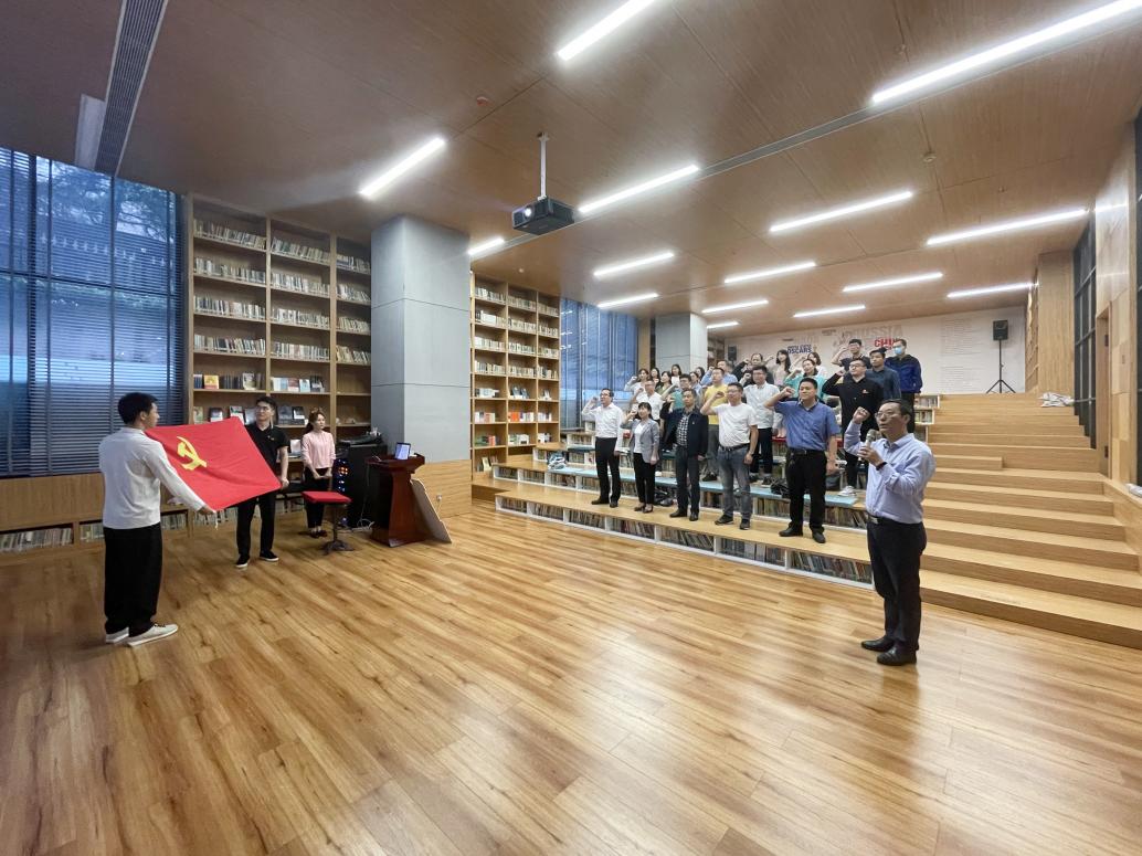 在电影党课教学现场,长安都柏林国际交通学院党总支书记汪海年带领全体党员面对鲜艳的党旗重温入党誓词。大家高举右拳,全体肃立,庄严宣誓。誓言铿锵,震撼着在场每一位党员,提醒大家在前进路上不忘初心和使命。党课学习结束后,全体学员合影留念。