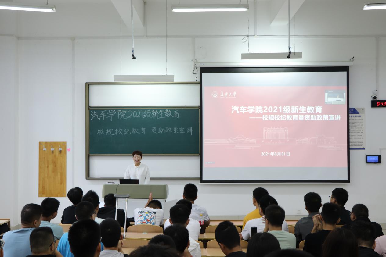 紧抓学风考风教育,营造良好氛围。为了进一步帮助新生树立遵规守纪、潜心学习的意识,8月31日下午,汽车学院党委书记倪凤英、2021级辅导员郑文捷为全体新生组织召开了校纪校规教育,对学生的权利与义务、体测、评优等重要内容予以详细阐释,用生动活泼的实践案例将校规校纪深入人心。9月2日上午,院教务秘书唐方琦为同学们开展了学籍管理与学风教育,让同学们从一入学就树立起认真学习,诚信考试的意识。