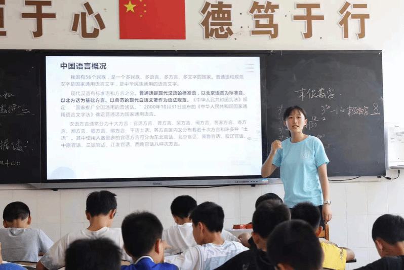 “怀抱‘清’衿之志,履践富‘峪’之程”暑期社会实践队前往清峪村北峪教学点,通过调查问卷、实地访谈等方式了解当地普通话使用情况,以常见词领读、经典古诗词诵读、书法讲解等形式带领教学点中的学生进一步提高普通话水平。