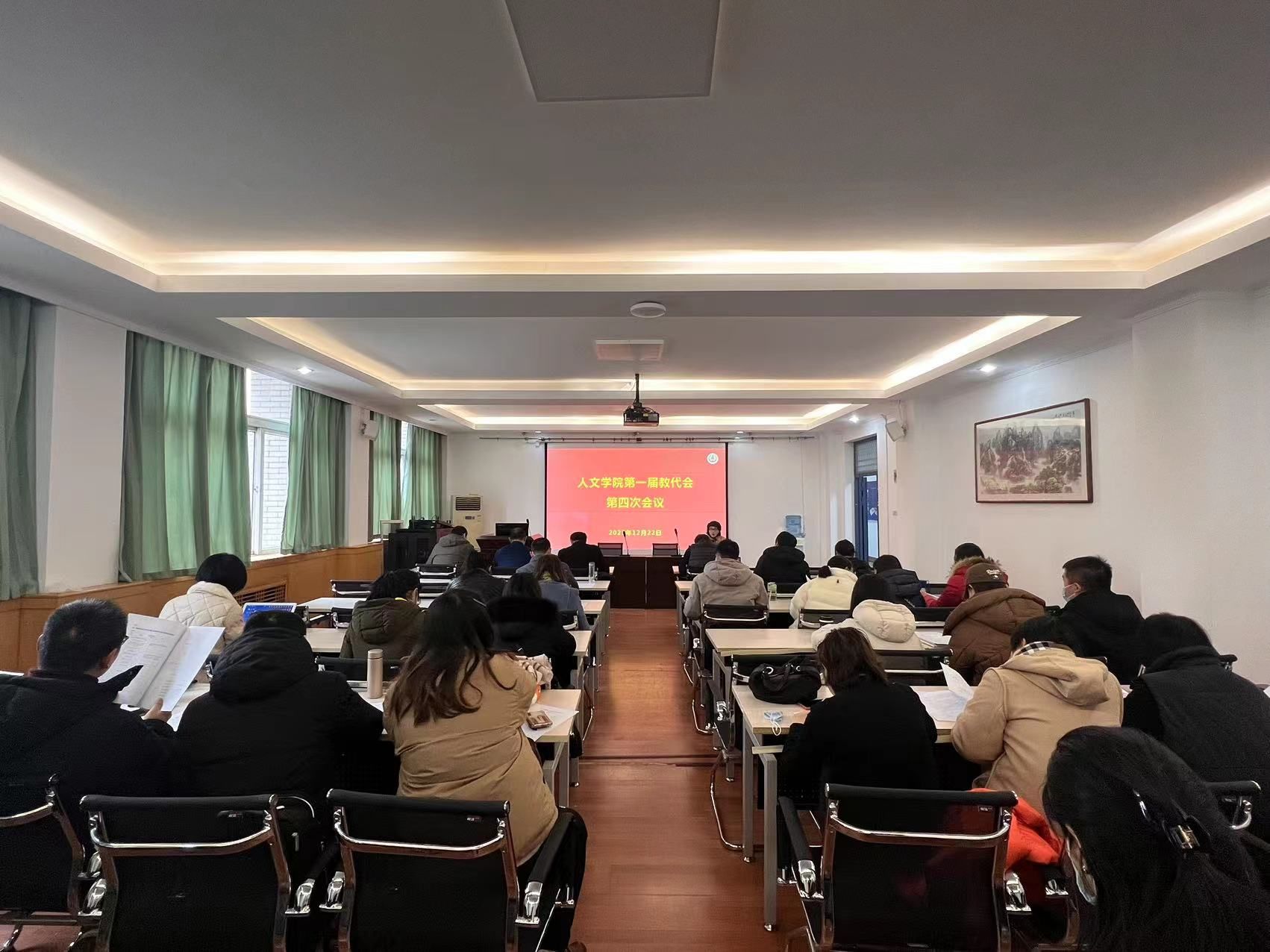 12月22日,人文学院召开第一届教职工代表大会第四次会议,讨论审议《人文学院教职工绩效考核实施办法(草案)》。校工会副主席杨利锋出席会议,人文学院全体教代会代表参加会议。会议由人文学院工会主席孙希娟主持,会议在雄壮的国歌声中拉开序幕。