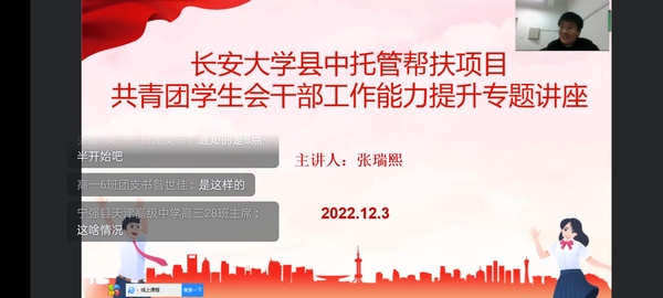 为推动学校县中托管帮扶工作,进一步提升帮扶高中学生干部工作能力,12月3日晚,帮扶高中学生工作干部能力提升专题讲座于线上举行。基础教育办公室/附属学校、焉耆县一中、宁强天津高级中学及巴州第四教育集团成员校相关负责领导、共青团学生会干部共386人参加了讲座。