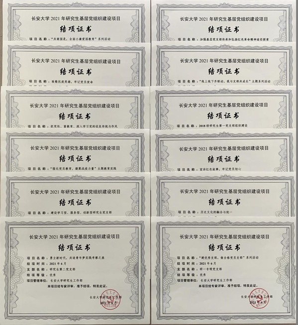 通过答辩评选,地测学院研一专硕党支部、资源学院2019级研究生第二党支部、资源学院2018级研究生第一党支部、马克思主义学院研究生第一党支部、马克思主义学院研究生第二党支部、建筑学院研究生第二党支部、机械学院博士生党支部、机械学院硕士生2019级第一党支部、水环学院2018级硕士研究生党支部、水环学院博士研究生党支部、汽车学院研究2018级第一党支部、汽车学院研究生2019级第二党支部,共12个项目获得优秀研究生基层党支部荣誉称号。
