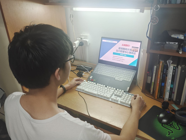 段海军分别围绕疫情期间大学生压力管理与认知调适策略、大学生行为管理与情绪调节策略以及大学生自我认知与行动计划三个方面展开。段海军采用理论和实践相结合的方式,从新冠肺炎应激反应、压力管理与心理调适策略、自我认知以及个人行动计划等方面分别向同学们阐述产生应激反应的来源、行为管理策略、情绪管理方法,提倡学生们要合理安排生活。在情绪管理方面,重点向学生介绍了情绪转变ABCDE法,引导同学们掌握释放压力的方法,通过聆听舒缓音乐等方式缓解压力,学会认知调节,保持积极乐观的心态。