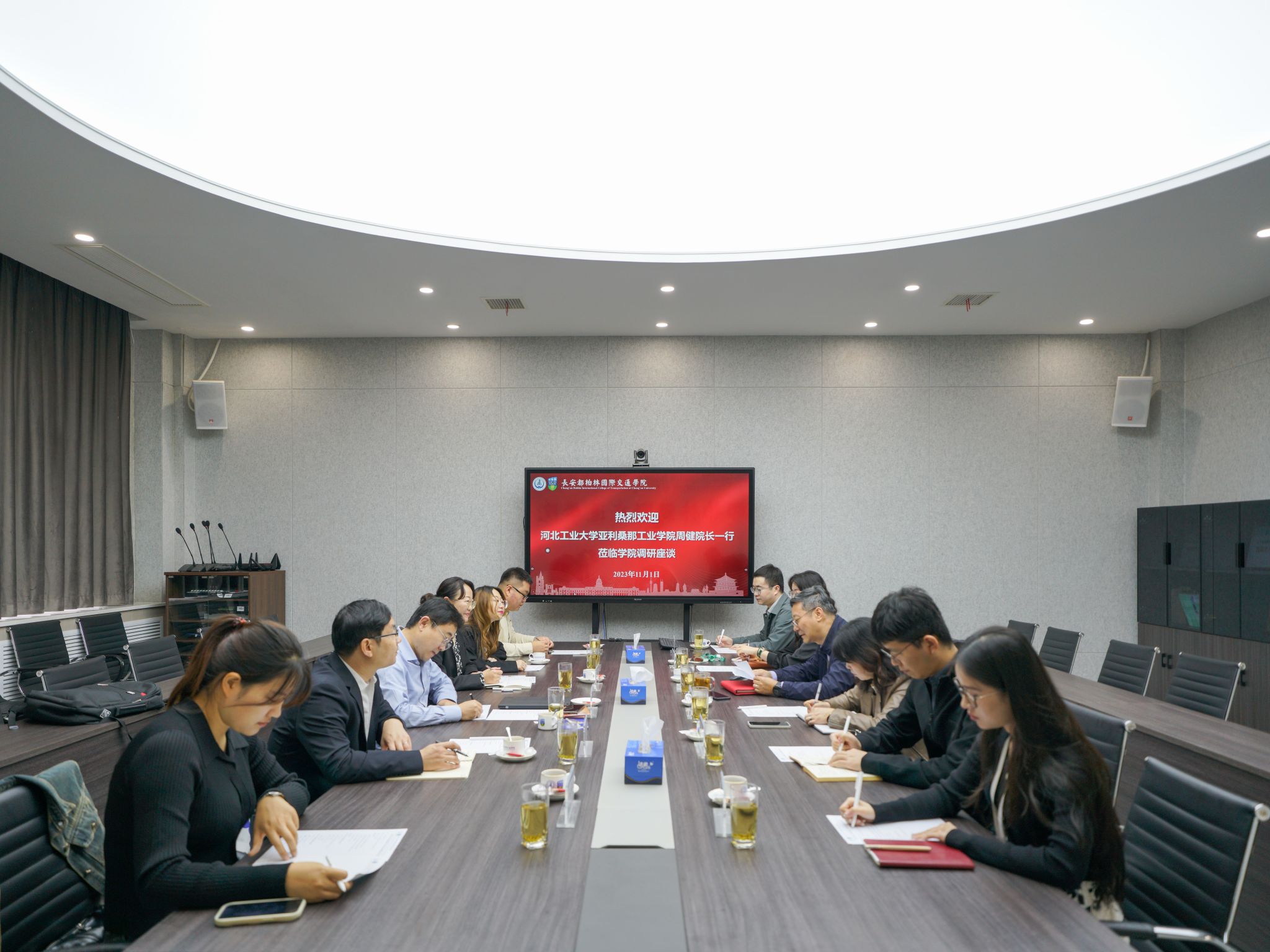 11月1日上午,河北工业大学亚利桑那工业学院院长周健一行莅临长安都柏林国际交通学院,就中外合作办学提质增效举措进行调研座谈。长安都柏林国际交通学院院长汪海年主持座谈会,党总支副书记张艳萍及院属各部门负责人参会。