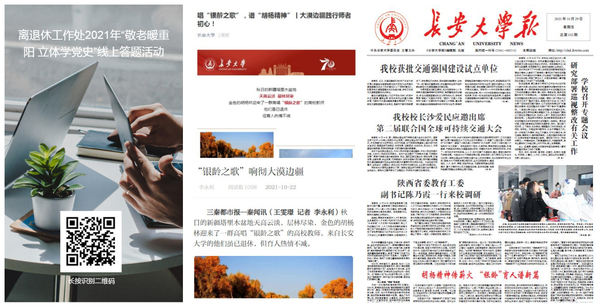 立体学知识,宣传显成效。为引导老同志积极看待老龄社会和老年生活,结合党史学习教育,10月11-14日,开展了“敬老暖重阳立体学党史”线上答题活动,将党史知识、重阳节知识、人口老龄化国情相关知识融入其中,500余名老同志参加答题活动。同时,广泛宣传离退休职工老有所乐、老有所为的风采,其中bat365“银龄教师”的事迹材料《唱“银龄之歌”,谱“胡杨精神”》、《“银龄之歌”响彻大漠边疆》被三秦都市报-秦闻、学校官方微信公众号、校报收录刊登。