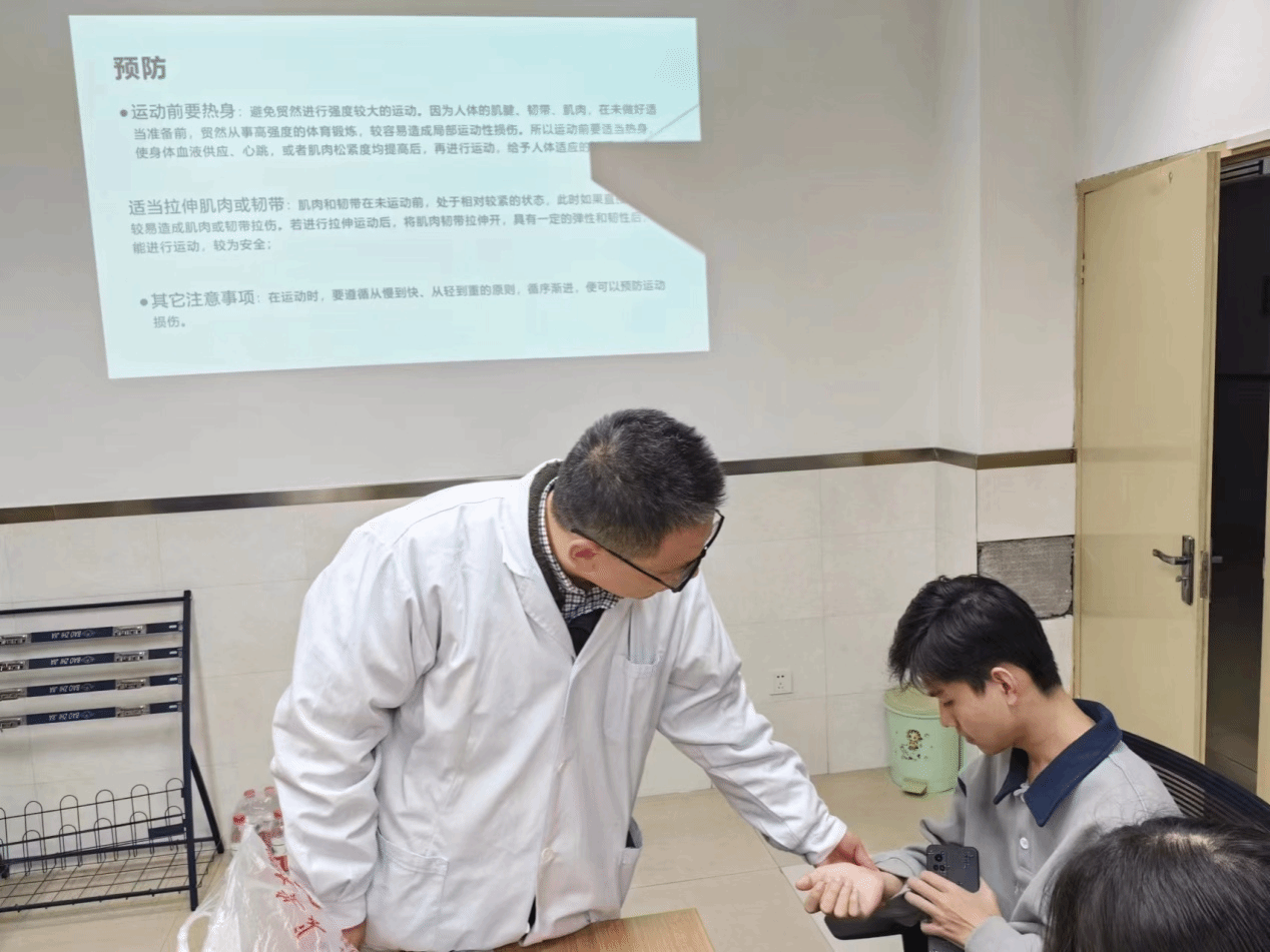 校医院副主任医师董俊文作《运动损伤预防及处理》专题讲座,他强调了运动损伤预防及处理对于保障运动会顺利进行的重要性,并结合多年临床案例,运用通俗易懂的语言和图文并茂的展示,从急性运动损伤的原理、分类、初步诊断、常见处理方法等方面进行了详细讲解。现场还与同学们进行互动,让同学们通过实操演练等方式切实掌握常见的运动损伤类型及预防措施,正确选择适合自己的运动方式、强度和安全防护,在运动前要做好充分的热身准备活动,遇到运动损伤时能够及时进行包扎固定。