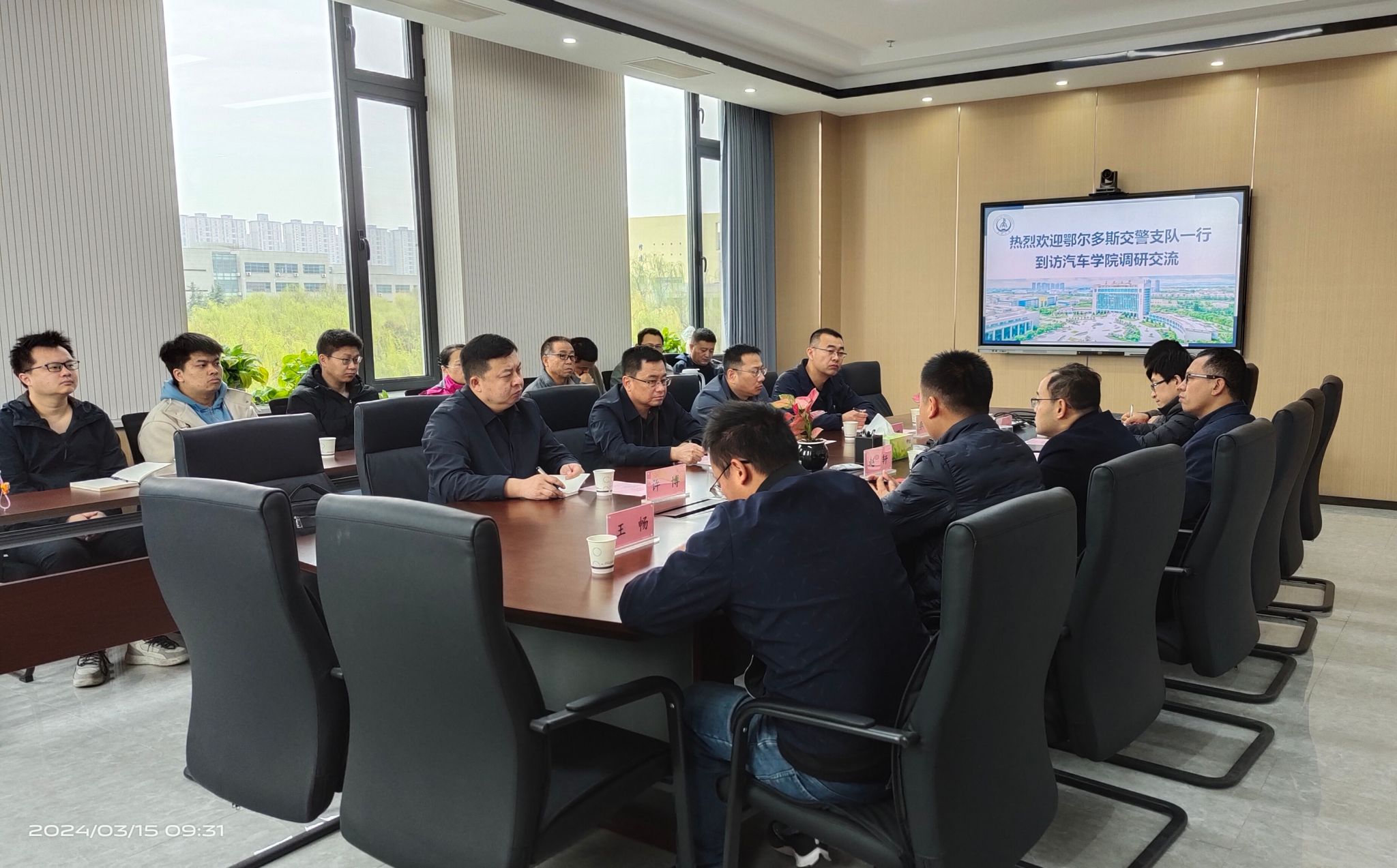 3月15日,鄂尔多斯交警队一行到汽车学院调研交流。鄂尔多斯交警支队党委委员、副支队长赵刚,事故大队大队长罗建军,指挥中心副主任许博,交安办专干李强一行四人到访汽车学院。汽车学院党委书记林贵宝、院长赵轩,副院长牛世峰,相关系室主任、教师代表参与调研座谈会。